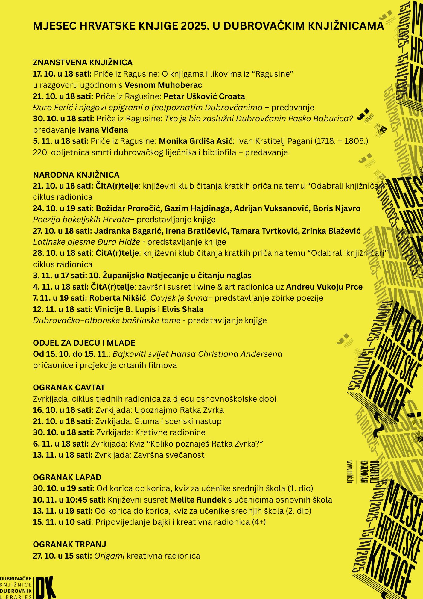 Narodna knjižnica Grad (Ulica od puča 6) svoj program Mjeseca hrvatske knjige počinje ciklusom radionica ČitA(r)telje (21.10., 28.10. i 4.11. u 18 sati), odnosno književnim klubom čitanja kratkih priča na temu Odabrali knjižničari (zbog ograničenog broja mjesta prijave se primaju na e-mail informacijska.sluzba@dkd.hr). Božidar Proročić, Gazim Hajdinaga, Adrijan Vuksanović i Boris Njavro, 24. 10. u 19 sati, predstavit će knjigu Poeziju bokeljskih Hrvata. Jadranka Bagarić, Irena Bratičević, Tamara Tvrtković i Zrinka Blažević predstavit će Latinske pjesme Đura Hidže 27. 10. u 18 sati. Deseto Županijsko Natjecanje u čitanju naglas održat će se 3. 11. u 17 sati. Predstavljanje zbirke poezije Čovjek je šuma Roberte Nikšić bit će 7. 11. u 19 sati, a 12. 11. u 18 sati, Vinicije Lupis i Elvis Shala predstavit će knjigu Dubrovačko–albanske baštinske teme.